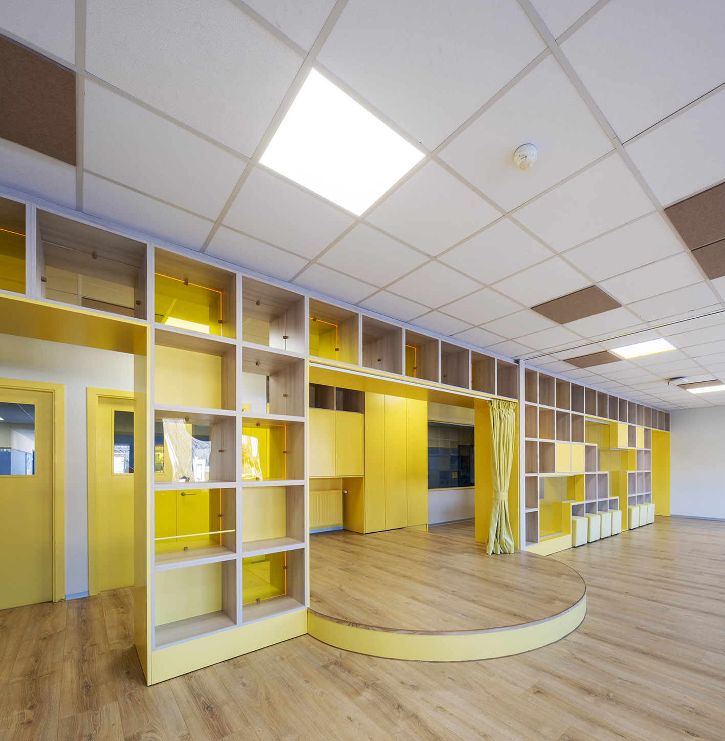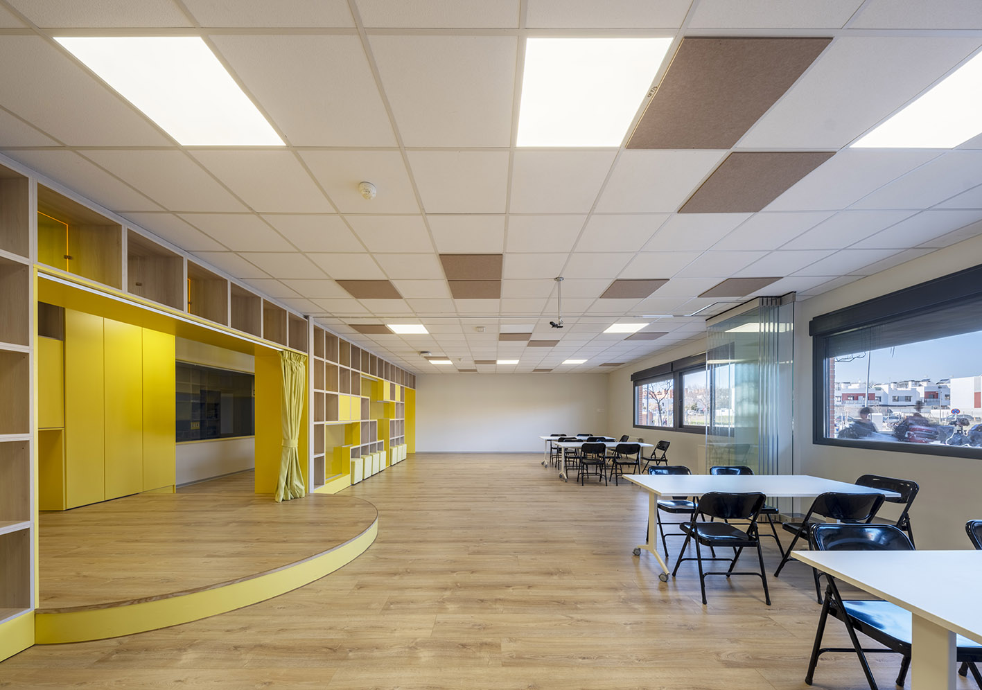 El programa que debía contener este espacio era muy heterogéneo y de escalas distintas Este espacio debía servir como salón de actos, sala de profesores, aula para trabajo colaborativo y  zona de lectura y representación para los alumnos de primaria principalmente.