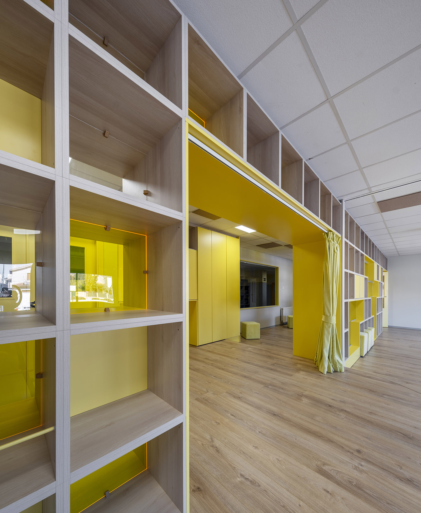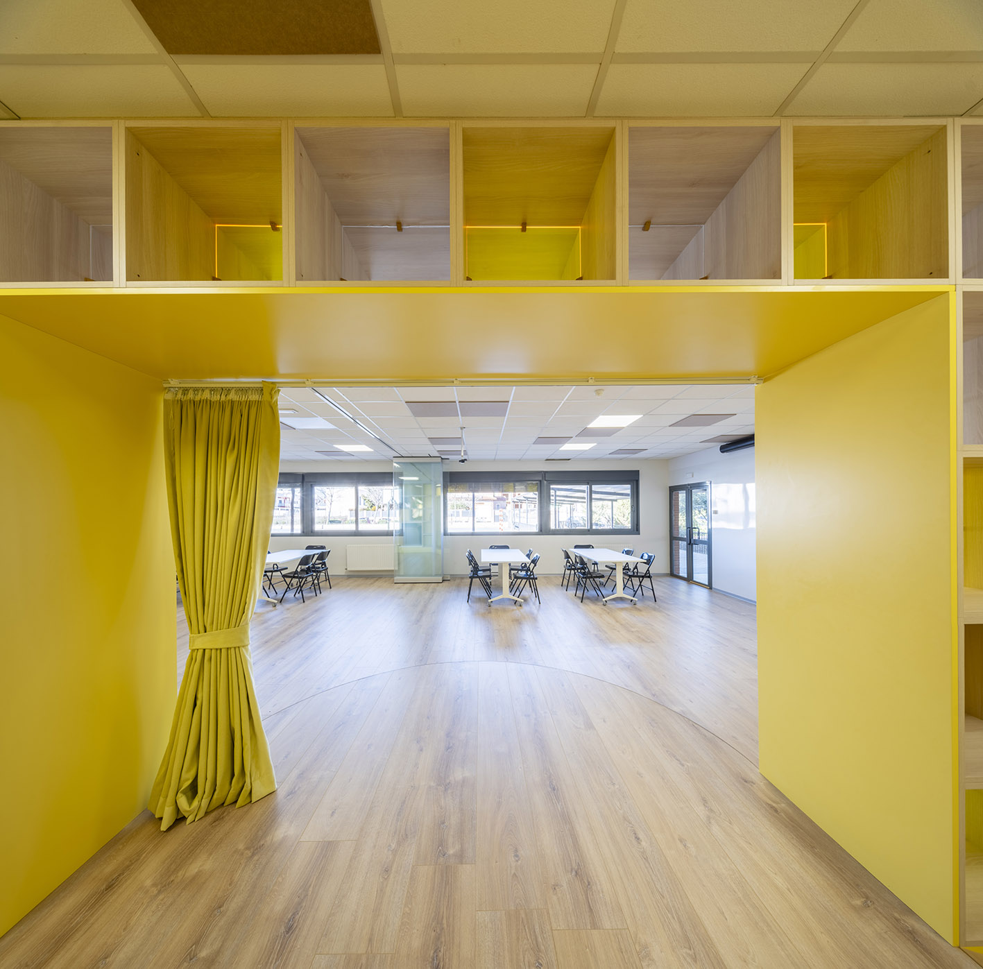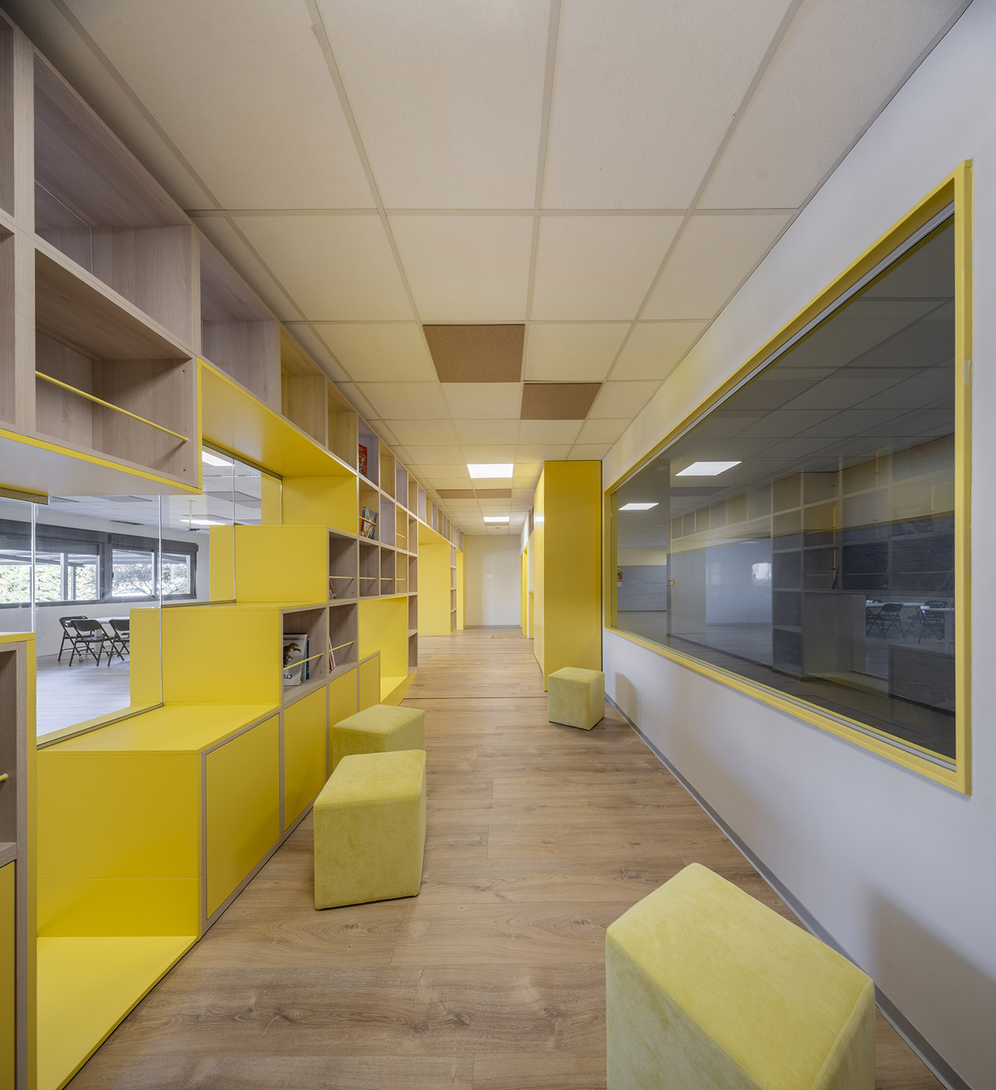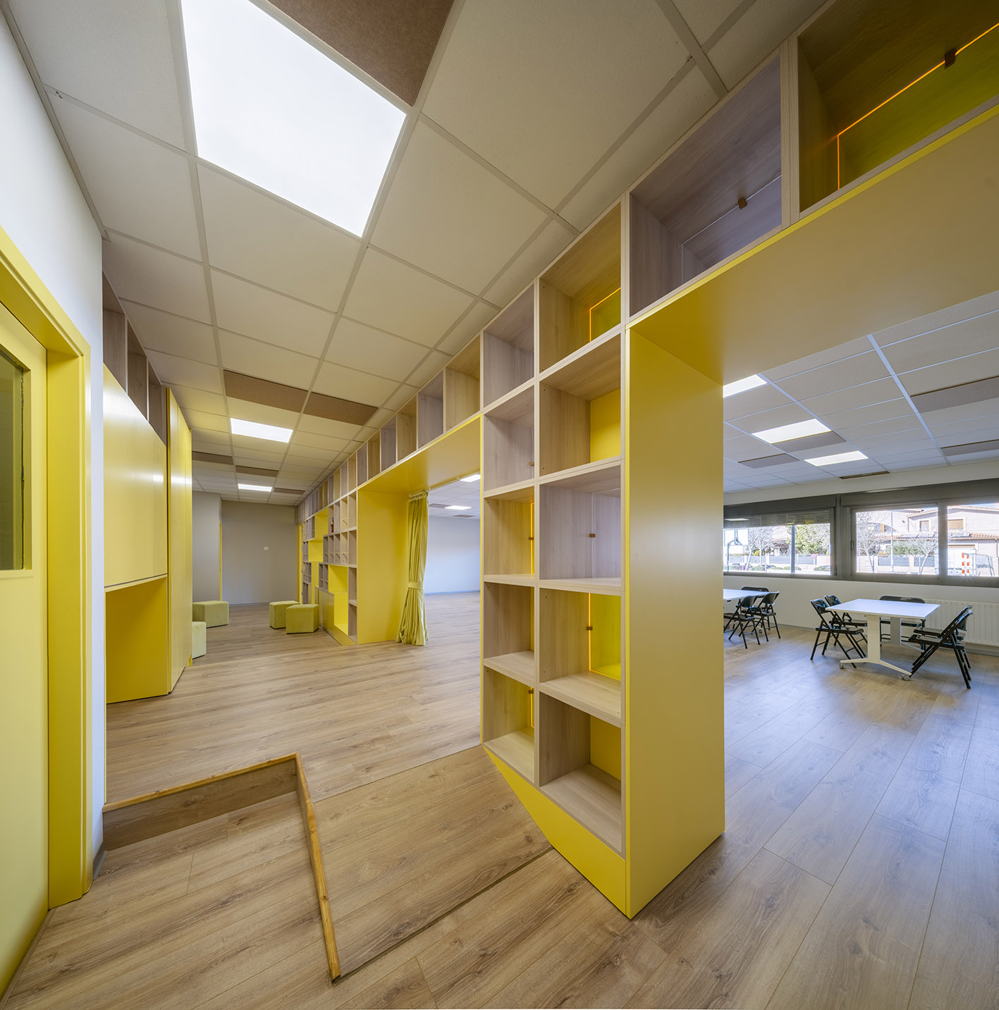 De esta forma, decidimos articular el espacio a través de un gran mueble longitudinal que se constituye en una banda equipada,  y que contiene el espacio de almacenamiento necesario para todo el programa integrando a su vez los elementos más complicados dentro de un espacio muy polivalente ( tal es el caso del pequeño escenario para representaciones o zonas de librería para el programa de biblioteca).  Este mueble consigue generar dos subespacios con escalas muy distintas y caracteres diferentes. El espacio hacia el lado del pasillo y con comunicación directa con este, funciona como punto de lectura dinámico, mientras que el espacio al otro lado, es diáfano y se puede dividir a través de un tabique móvil . De esta forma puede utilizarse de forma completa como salón de actos y dividido en dos subespacios, como sala de profesores o de trabajo colaborativo.