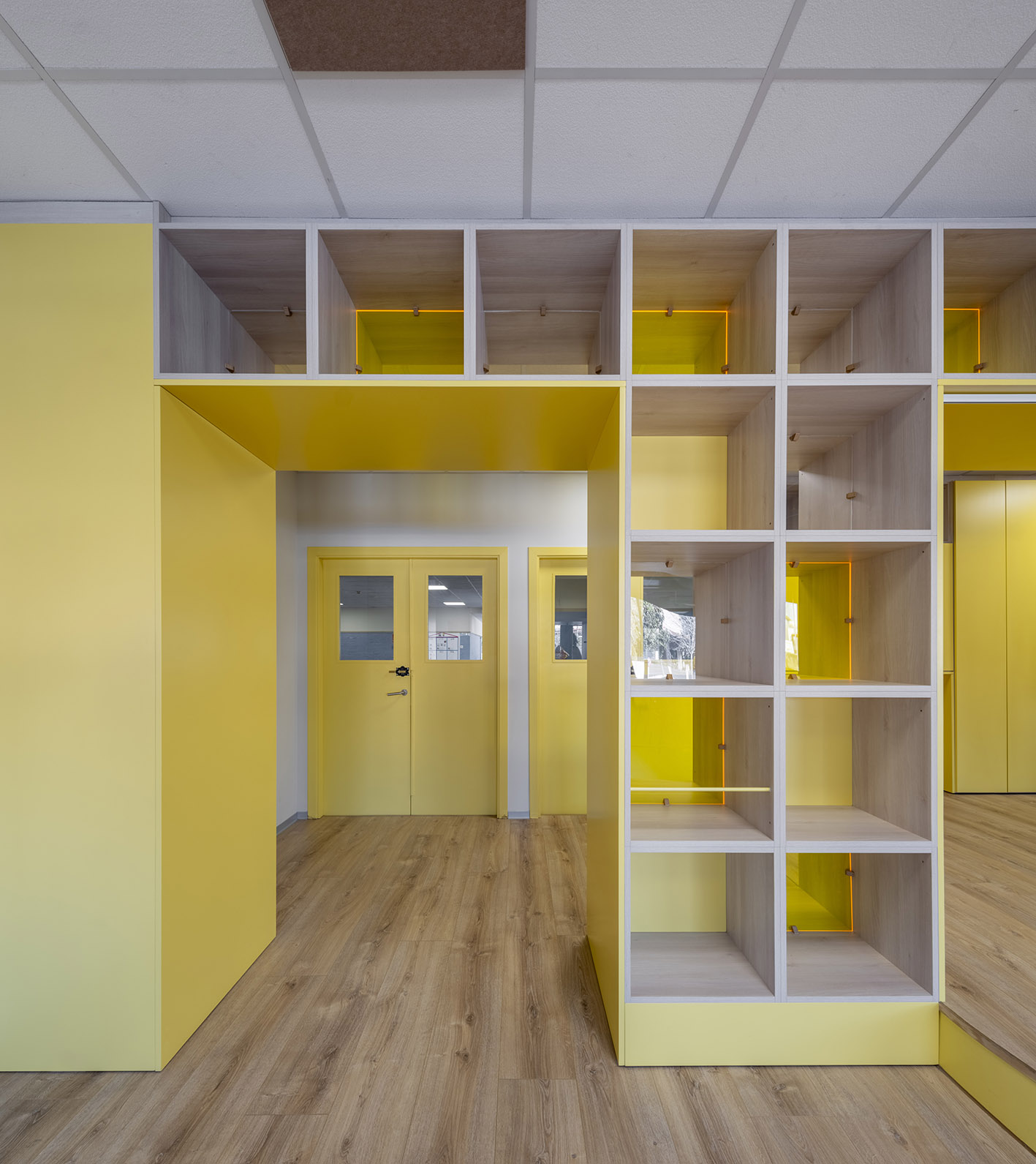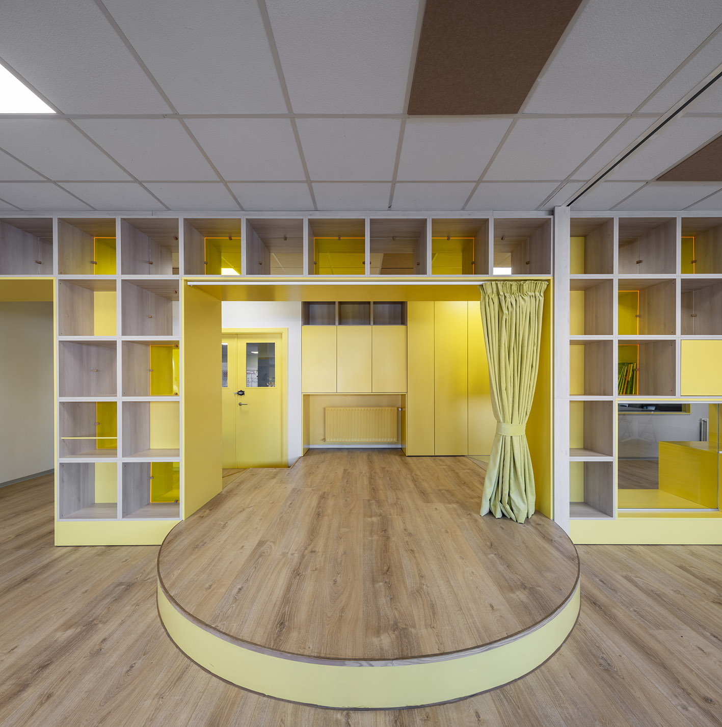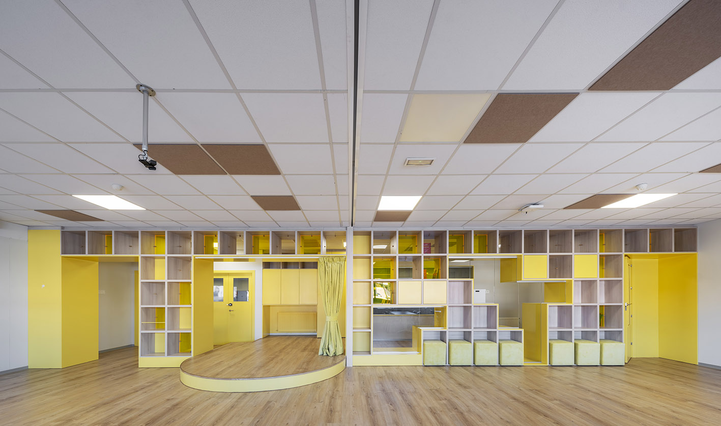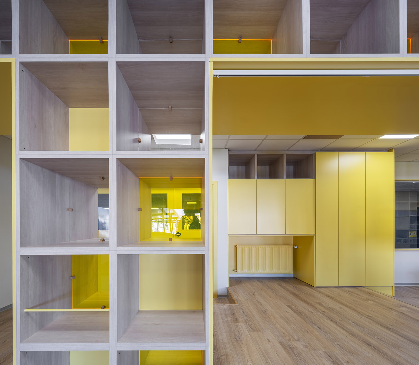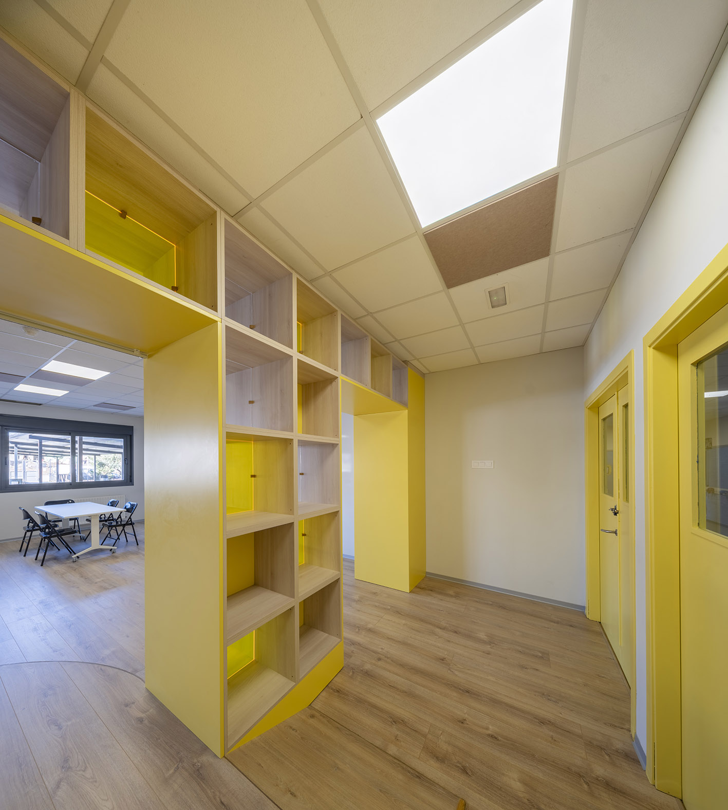 De esta forma, decidimos articular el espacio a través de un gran mueble longitudinal que se constituye en una banda equipada,  y que contiene el espacio de almacenamiento necesario para todo el programa integrando a su vez los elementos más complicados dentro de un espacio muy polivalente ( tal es el caso del pequeño escenario para representaciones o zonas de librería para el programa de biblioteca).  Este mueble consigue generar dos subespacios con escalas muy distintas y caracteres diferentes. El espacio hacia el lado del pasillo y con comunicación directa con este, funciona como punto de lectura dinámico, mientras que el espacio al otro lado, es diáfano y se puede dividir a través de un tabique móvil . De esta forma puede utilizarse de forma completa como salón de actos y dividido en dos subespacios, como sala de profesores o de trabajo colaborativo.